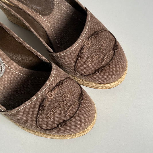 Prada Logo Embroidered Wedge Sandals in Light Brown Colour