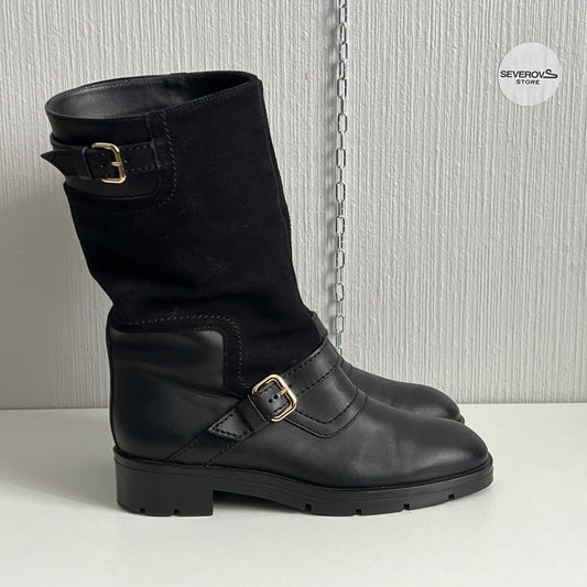 Tod's Black Leather and Suede Fibbie Mid Calf Biker Boots