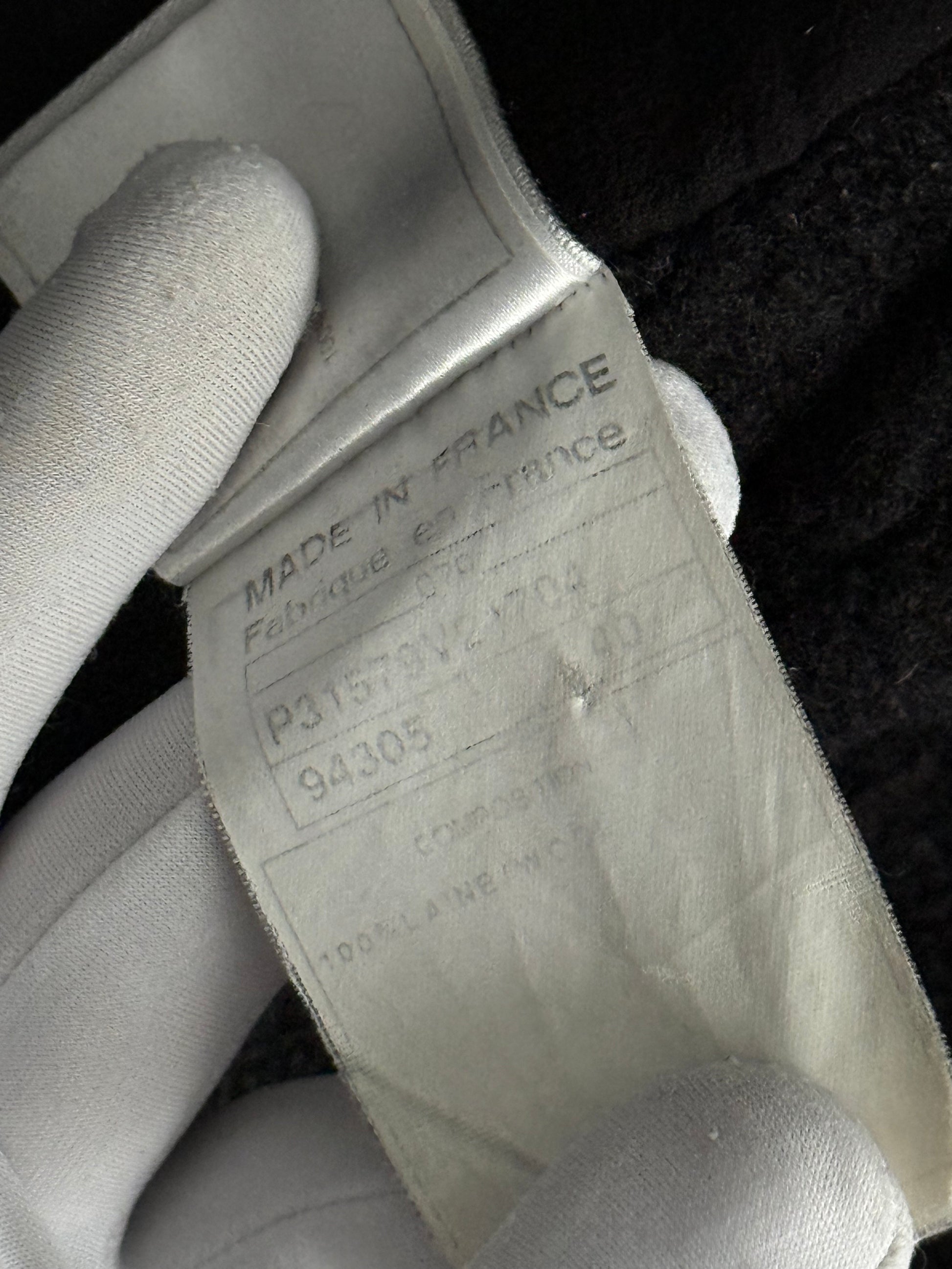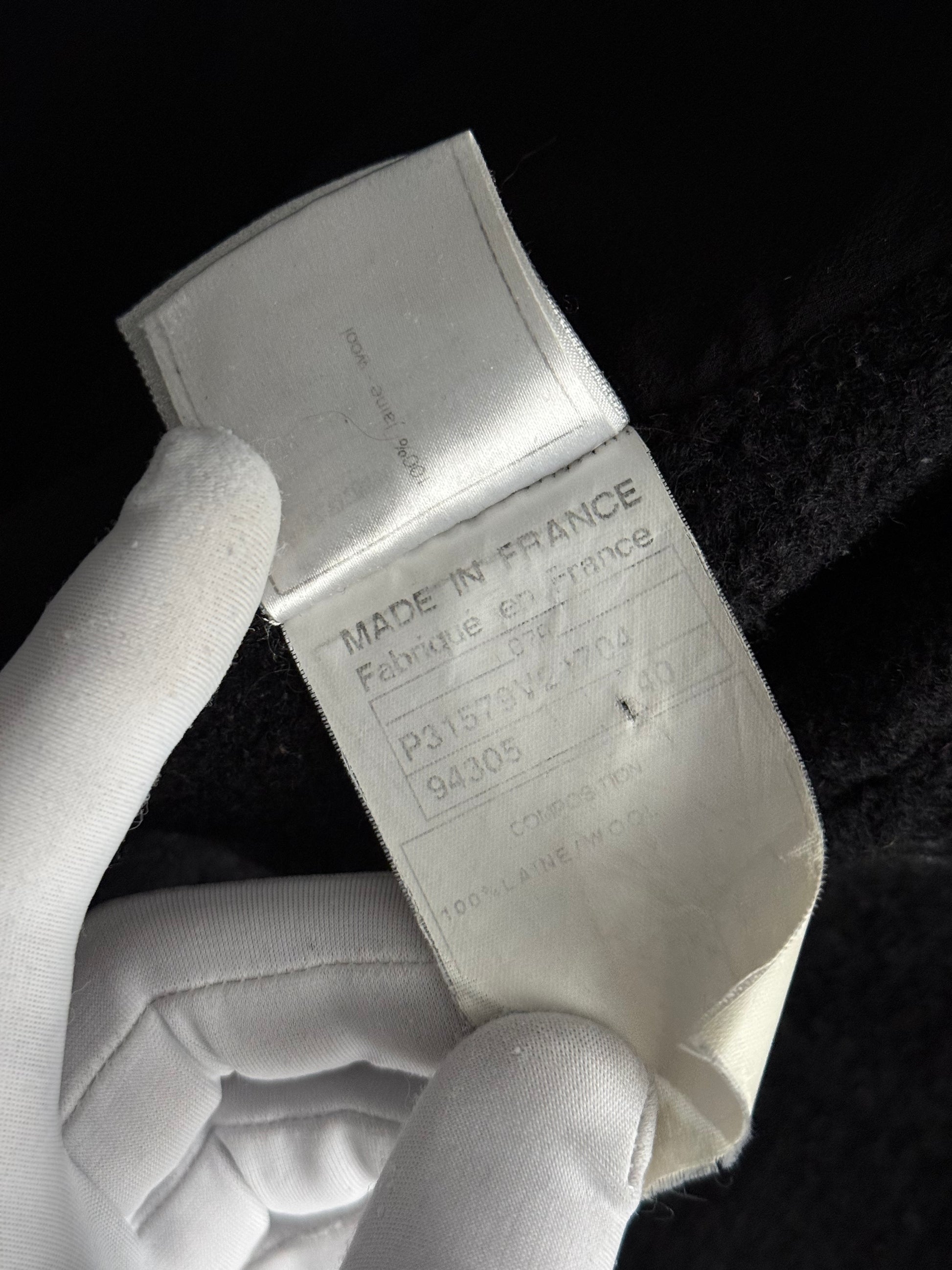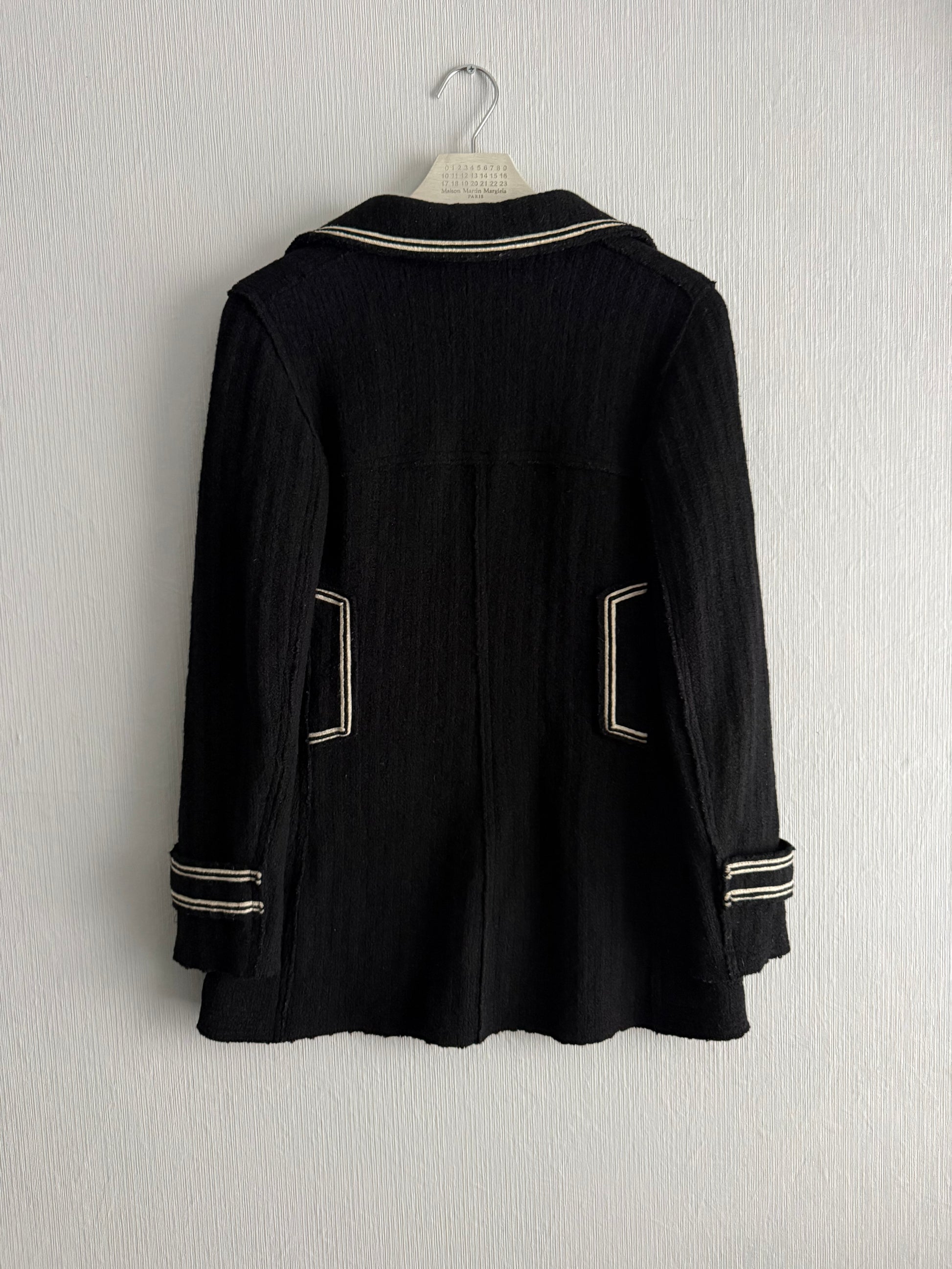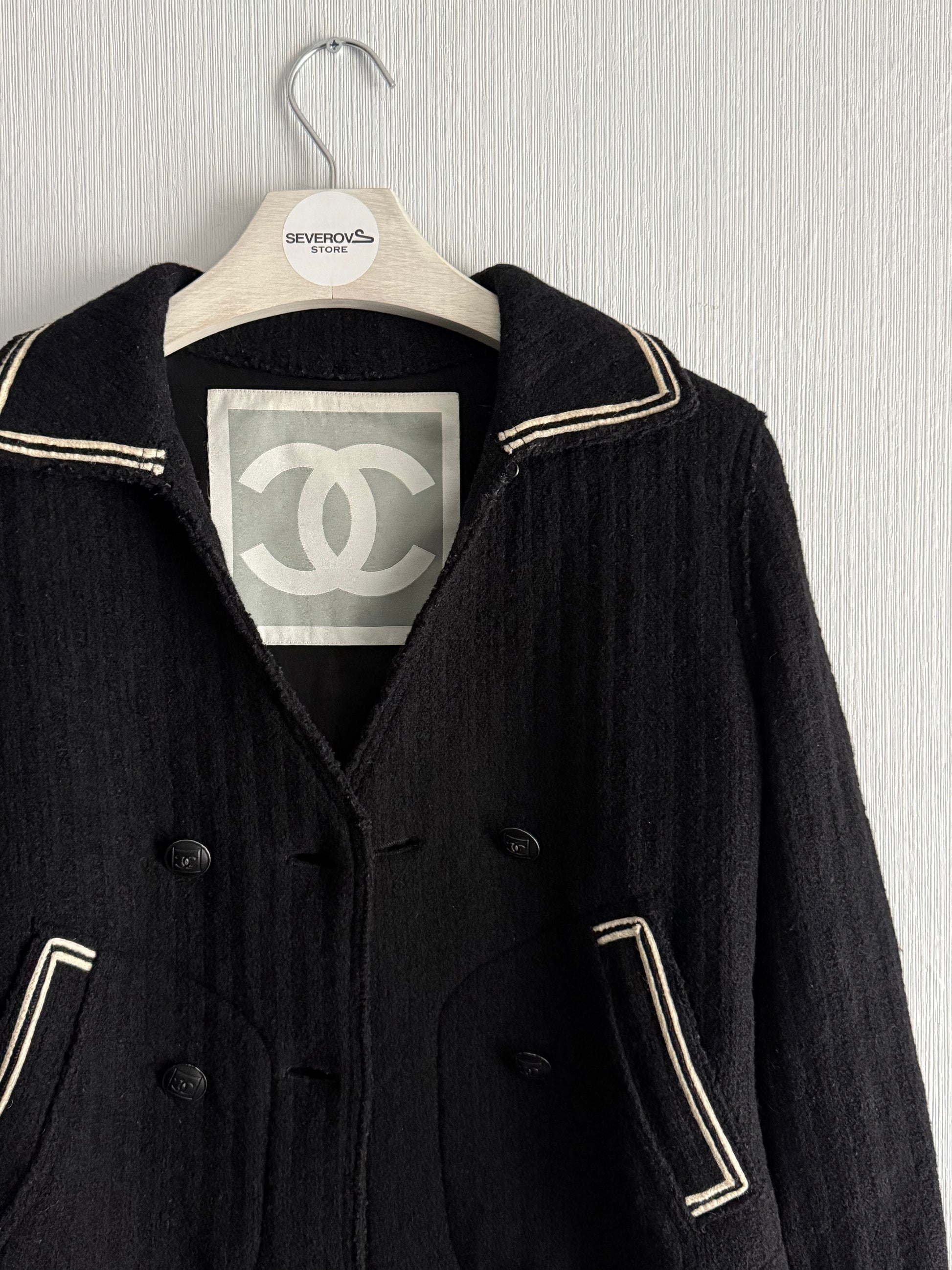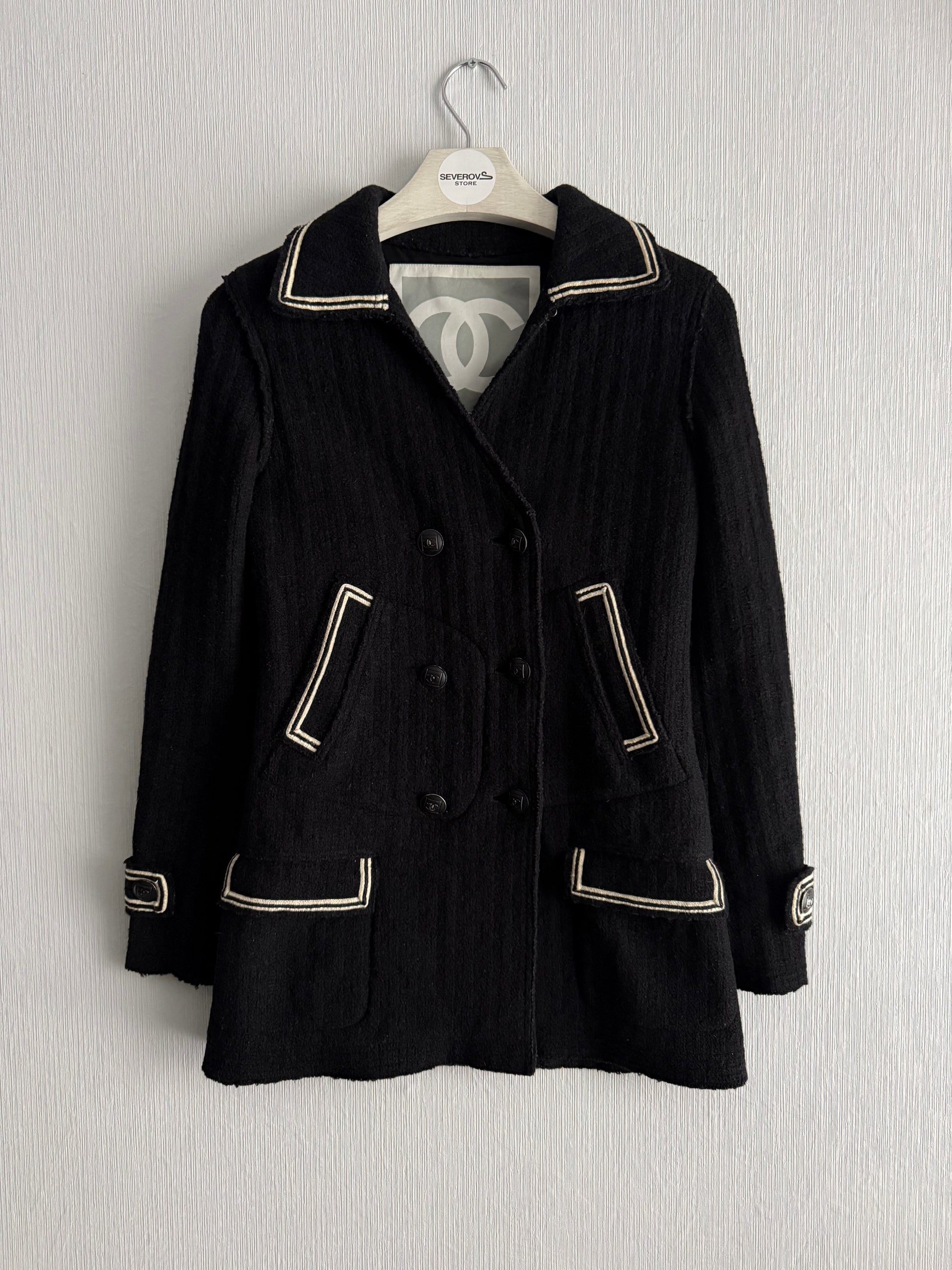 Pre-owned Fall/Winter 2007 Chanel black wool coat featuring a refined silhouette with the original notched lapel professionally removed for a more sophisticated and modern look. The piece has long sleeves with buttoned cuffs, white striped trim throughout, four slip pockets at the hip, and a double-breasted closure with buttons showing minor paint chipping consistent with wear. Finished with luxurious silk lining on the back and sleeves for added comfort and refinement.