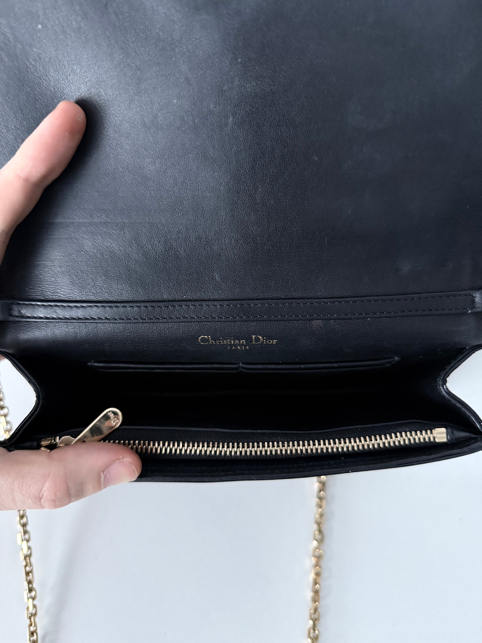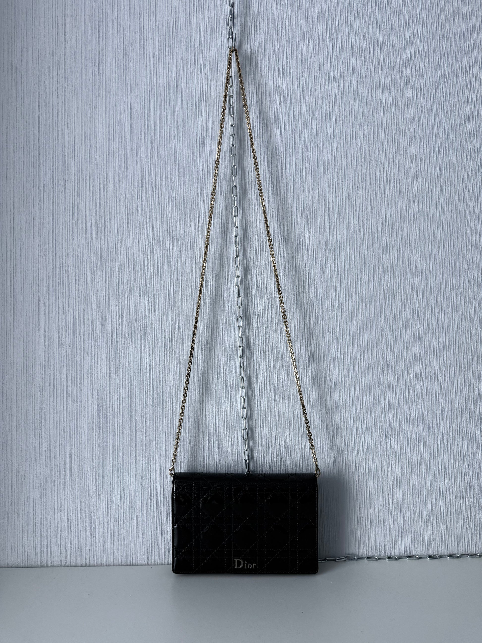 Dior Lady Dior pouch in black patent leather featuring the signature Cannage quilting and gold-tone Dior logo on the front. The bag has a flap closure with a magnetic snap and a gold-tone chain strap. The interior includes multiple compartments for cards and essentials. The chain can be worn in two ways: longer for crossbody and shorter for shoulder wear. It can be detached as well. Includes dust bag.
