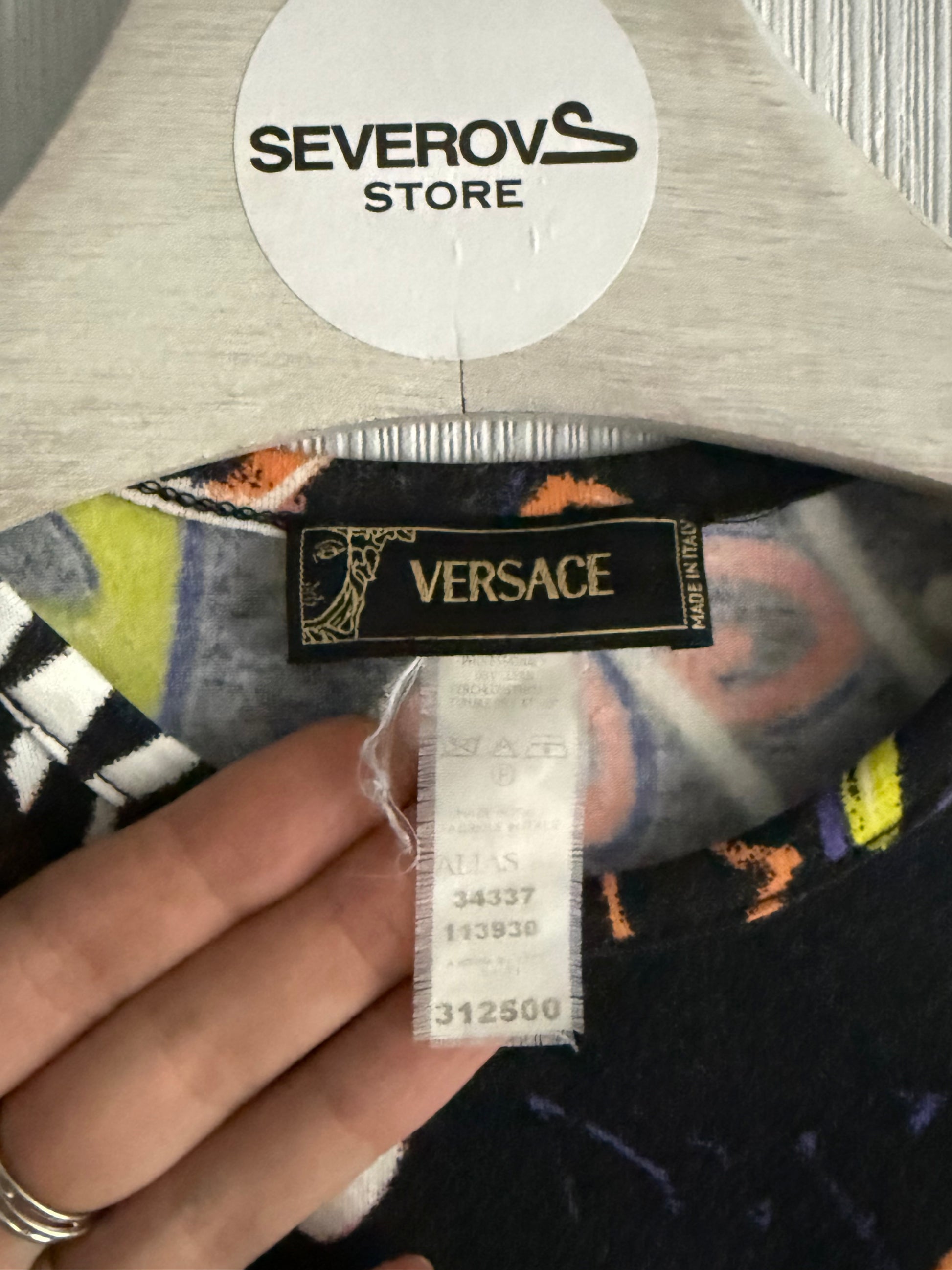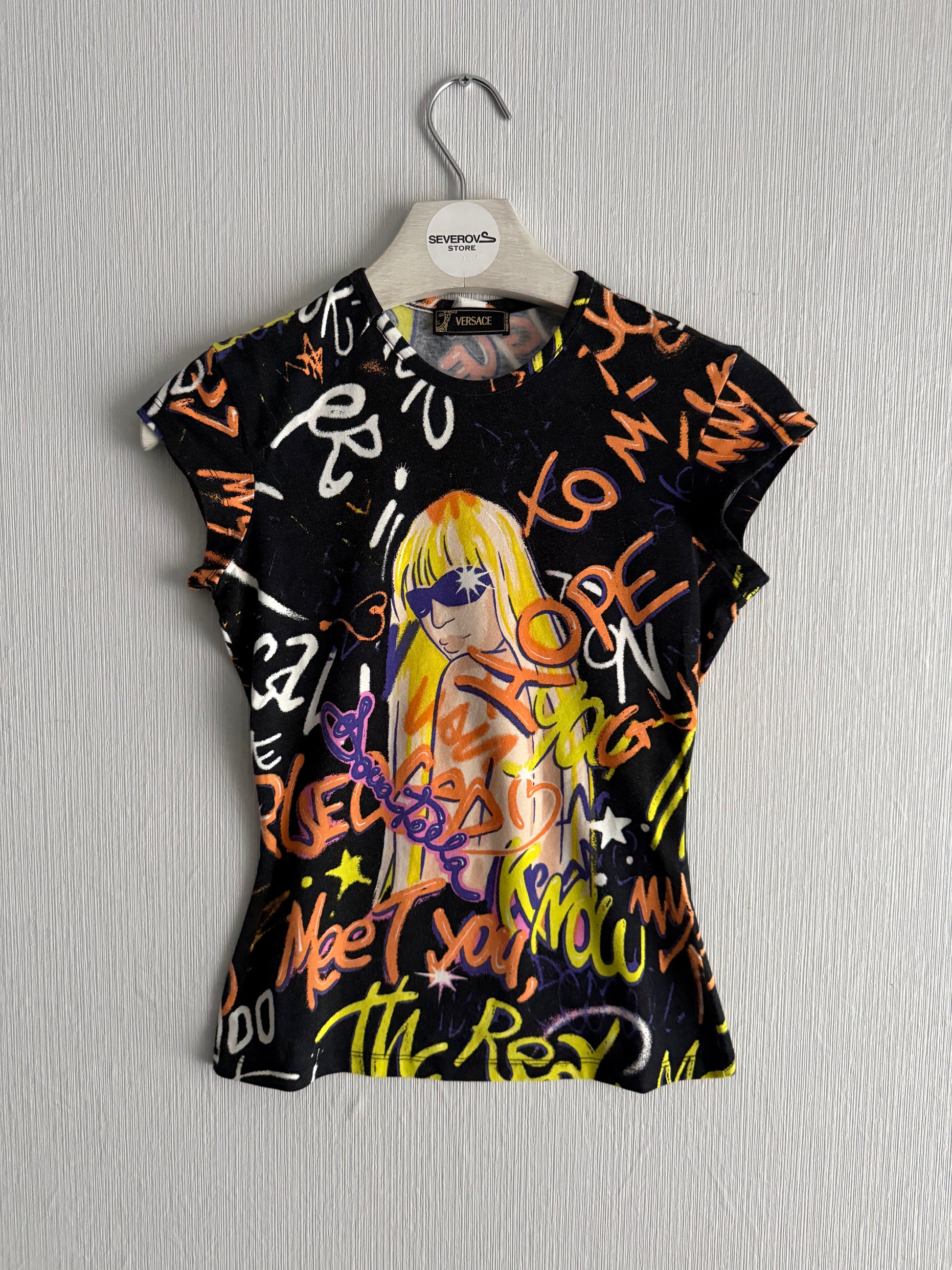 An extremely rare Versace T-shirt from the early 2000s. It features a hand-drawn, graffiti-style print of Donatella Versace with vibrant colors. It was worn by the Diva herself on the Versace spring/summer 2004 show. Especially desirable among archival fashion collectors and Y2K revival buyers.