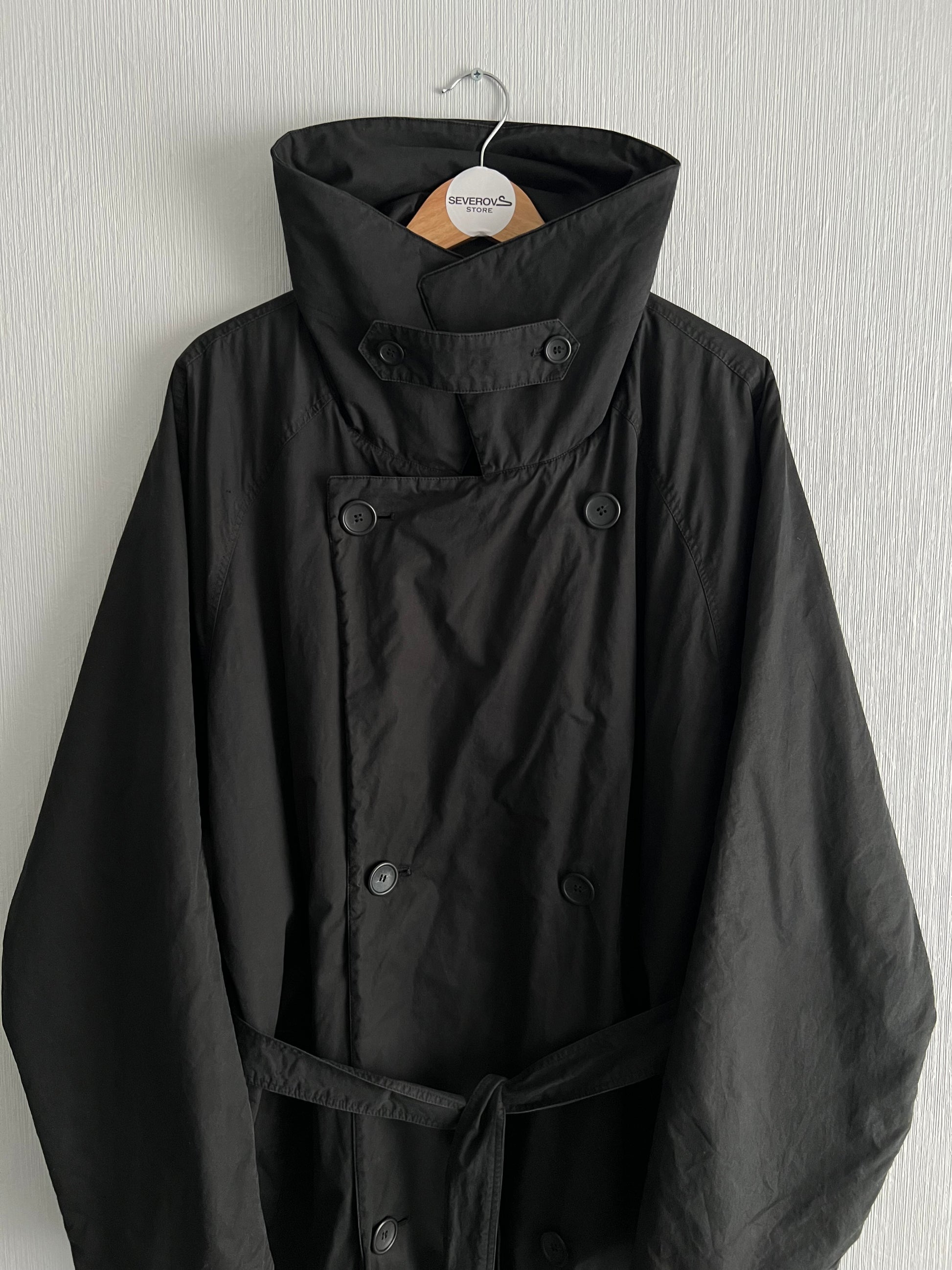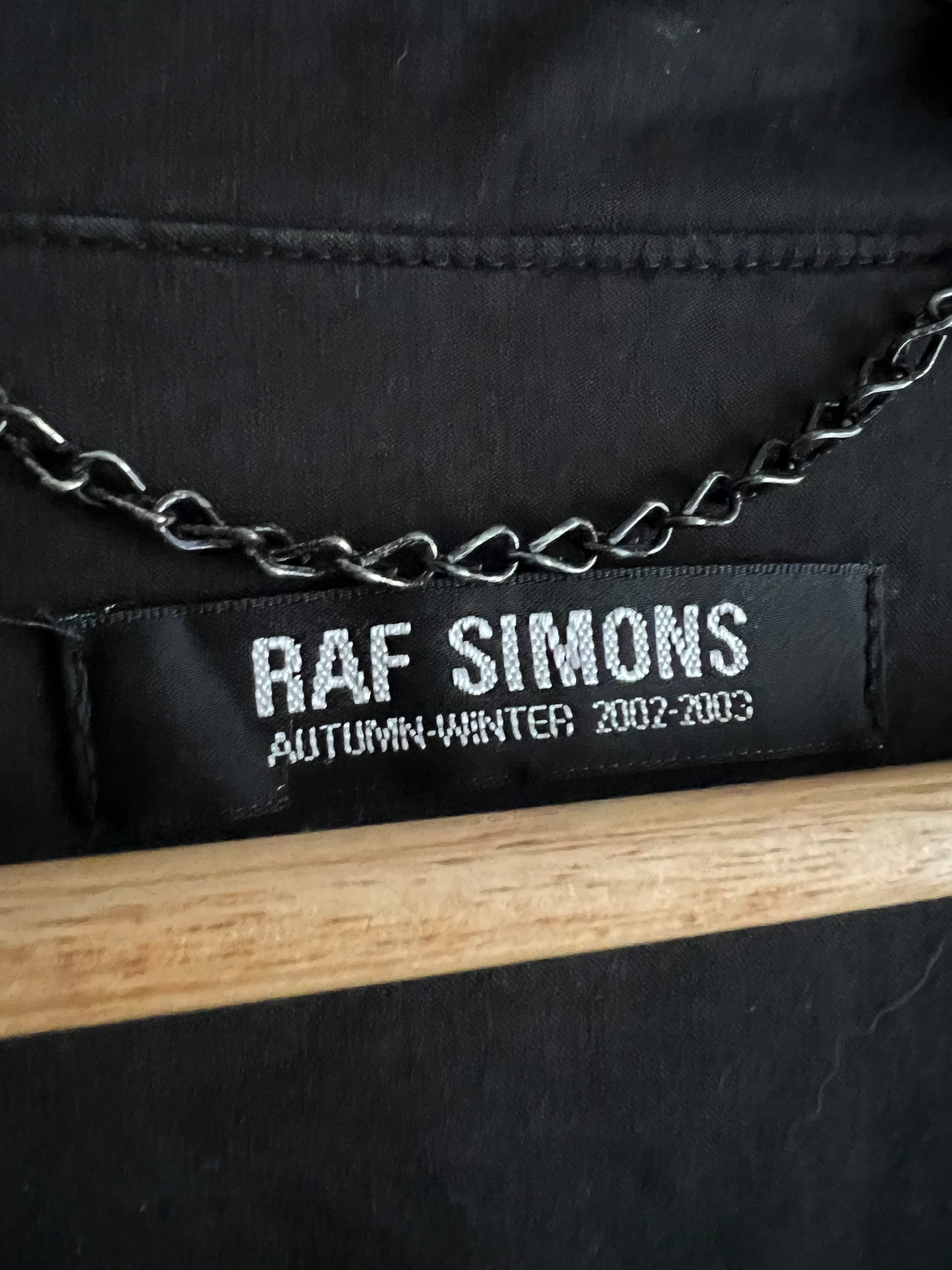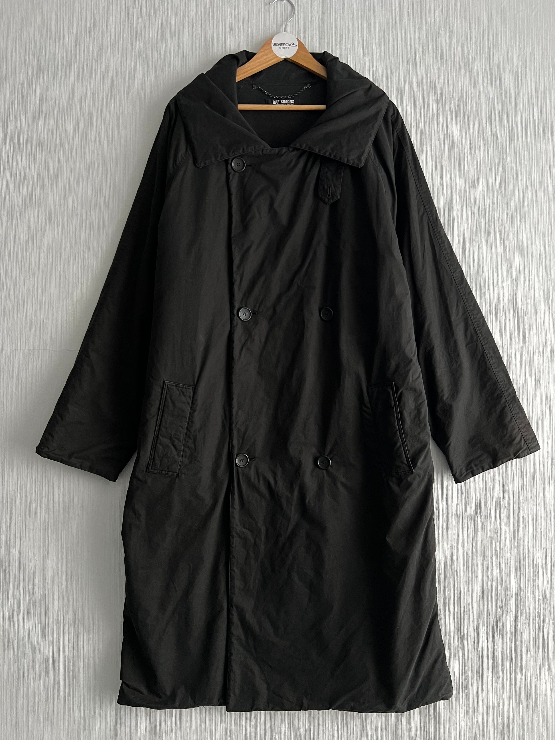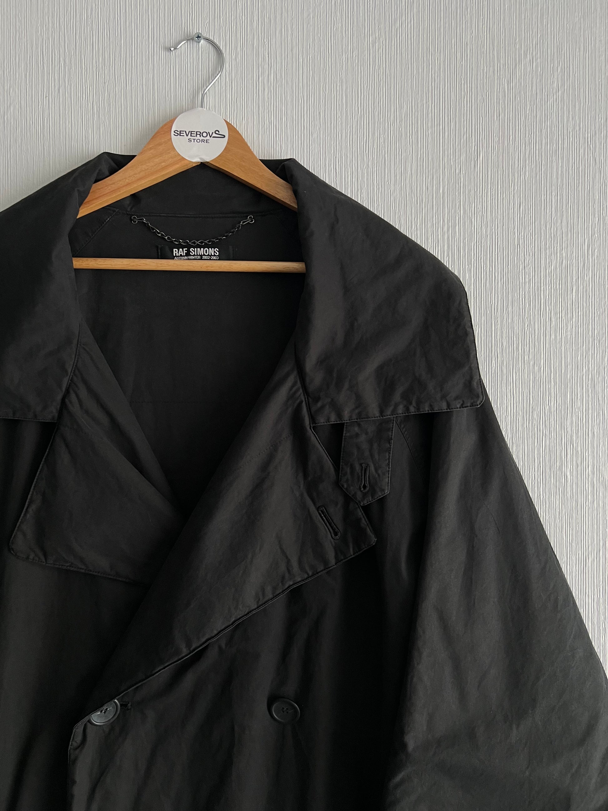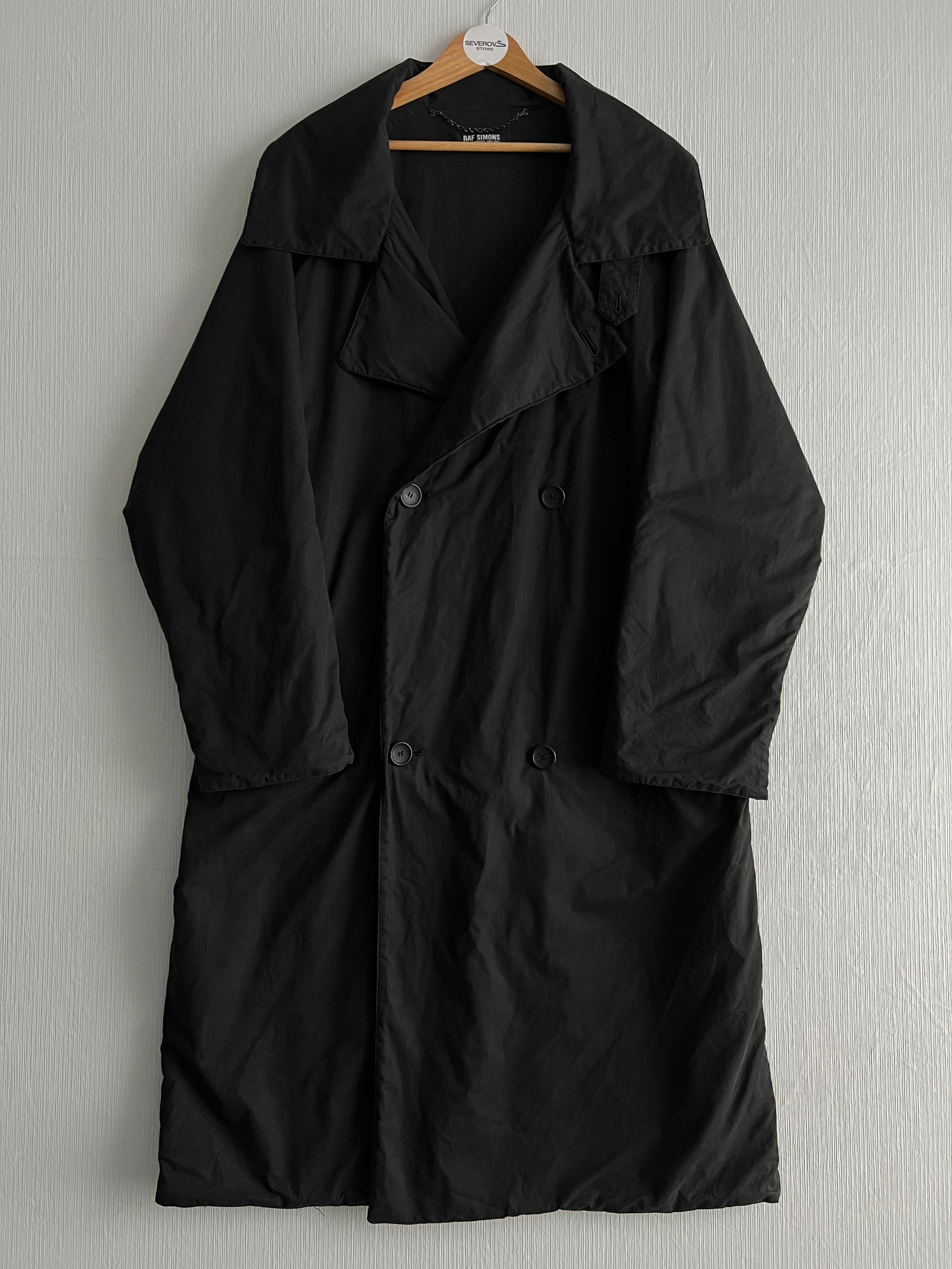 Iconic Raf outerwear. This oversized trench was heavily featured in Riot! Riot! Riot! (FW01) and produced again the following season (Virginia Creeper AW02, as per tag). Rare early-2000s Raf silhouette — dramatic proportions, wide lapels, double-breasted closure. True archive piece linked directly to one of Raf’s most legendary shows.