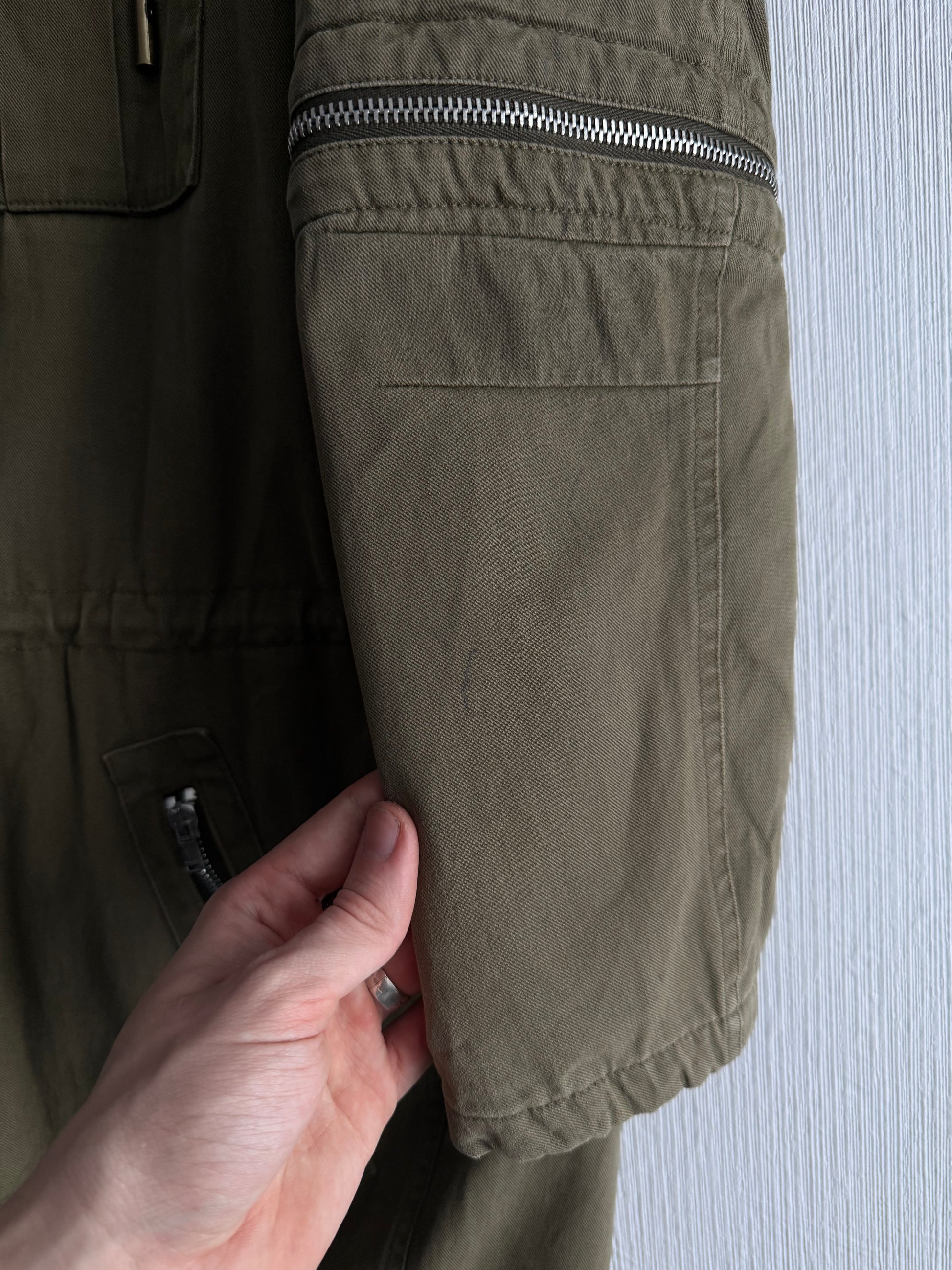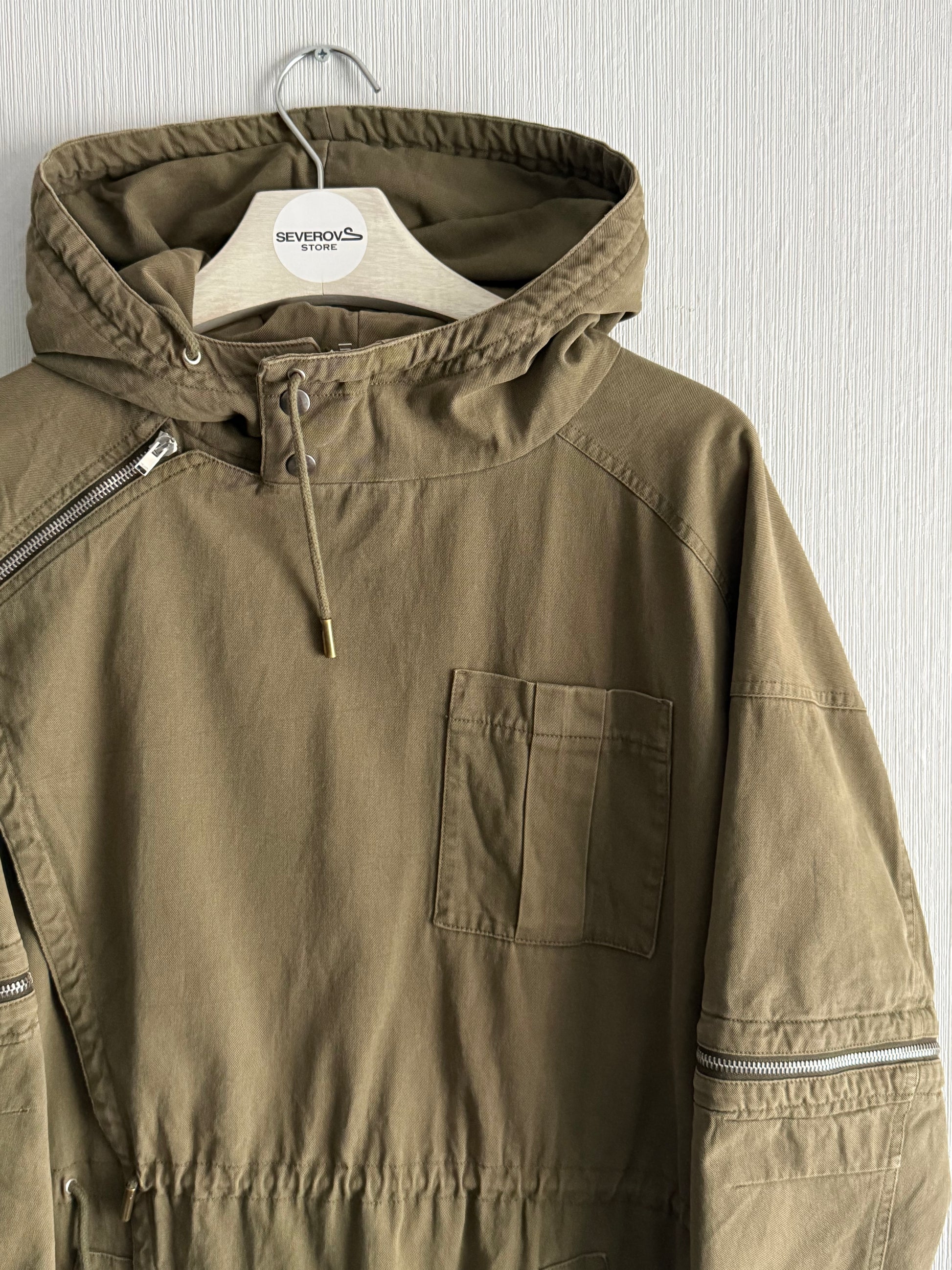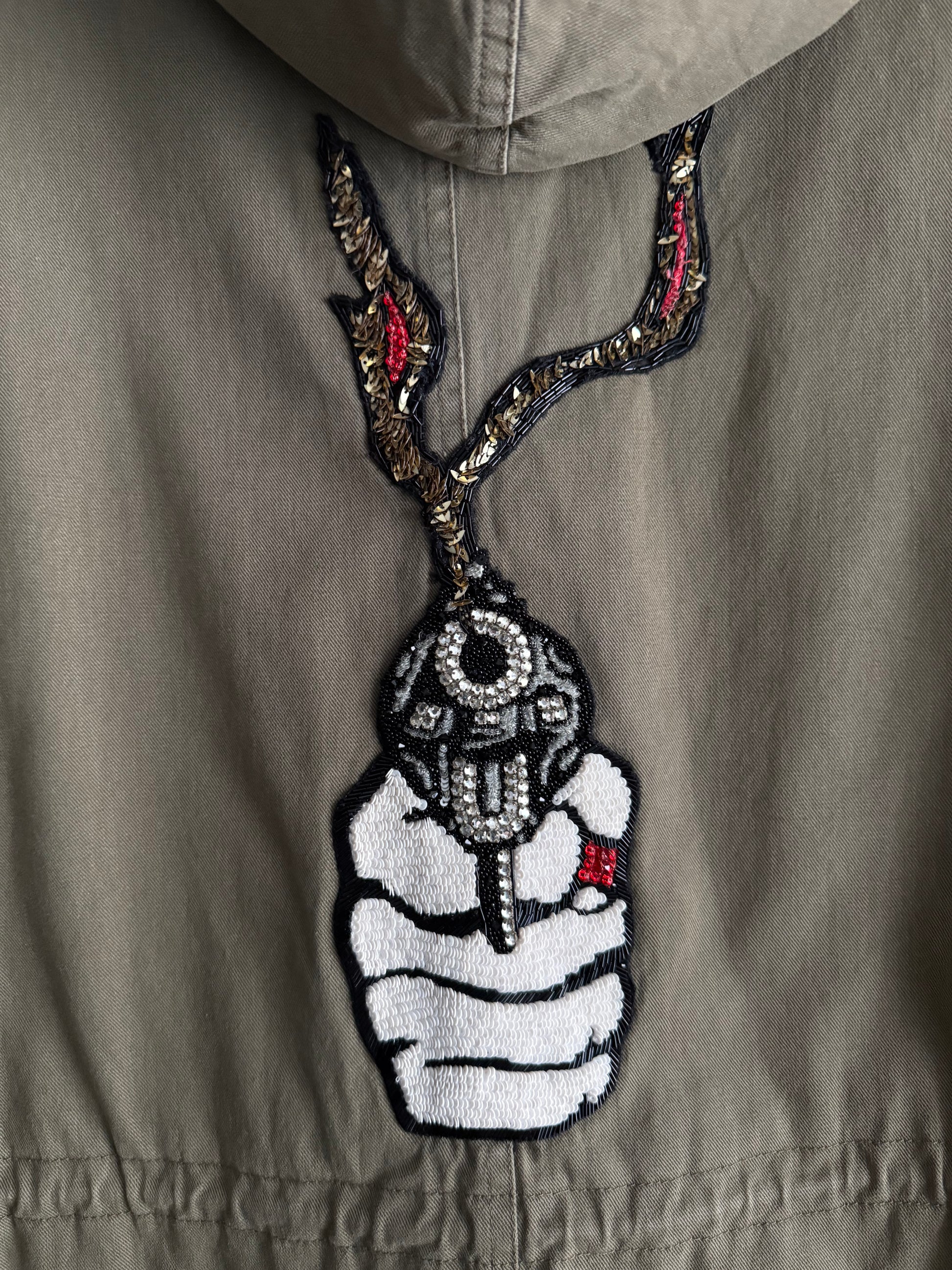 Khaki cotton parka with hood, zip closure and long sleeves that can be transformed into 3/4 sleeves. Sequin pattern on back.